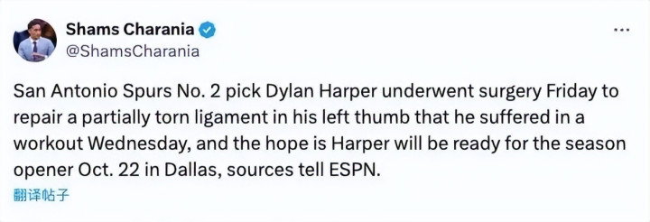 哈珀在近日训练中遭遇左手拇指韧带部分撕裂,已接受手术治疗,有望在今年10月23日在达拉斯举办的新赛季揭幕战复出。