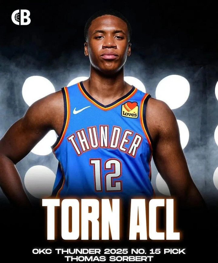 雷霆的25届首轮15号秀托马斯-索伯,在训练中遭遇右膝前十字韧带撕裂,25-26赛季全部报销。