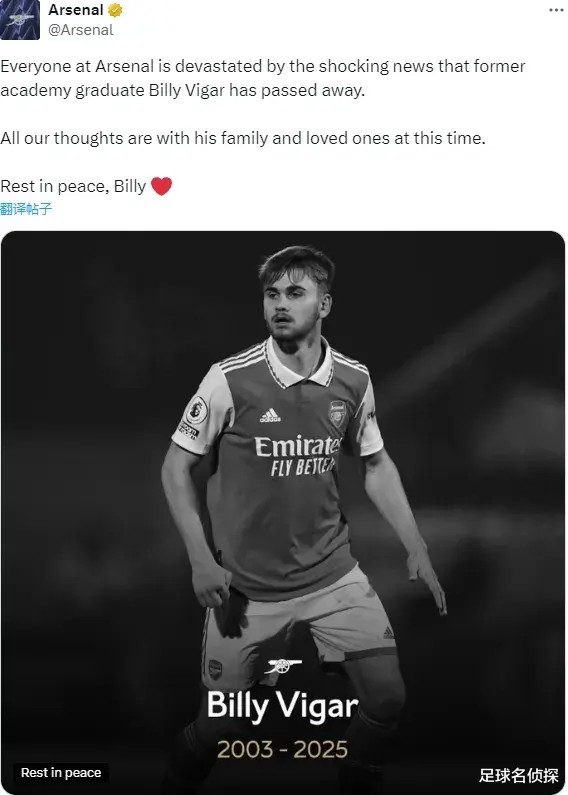 前阿森纳青训球员比利-维加最近在代表奇切斯特城的比赛中遭受严重脑损伤不幸离世,年仅21岁。