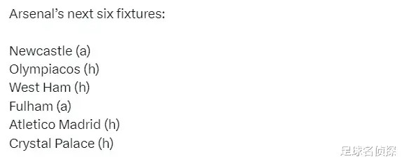 阿森纳未来6场比赛:客战纽卡斯尔、主战奥林匹亚科斯、主战西汉姆、客战富勒姆、主战马竞、主战水晶宫。