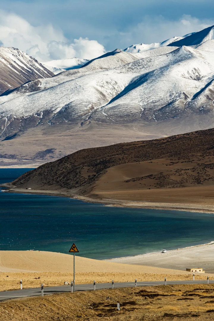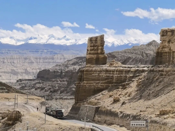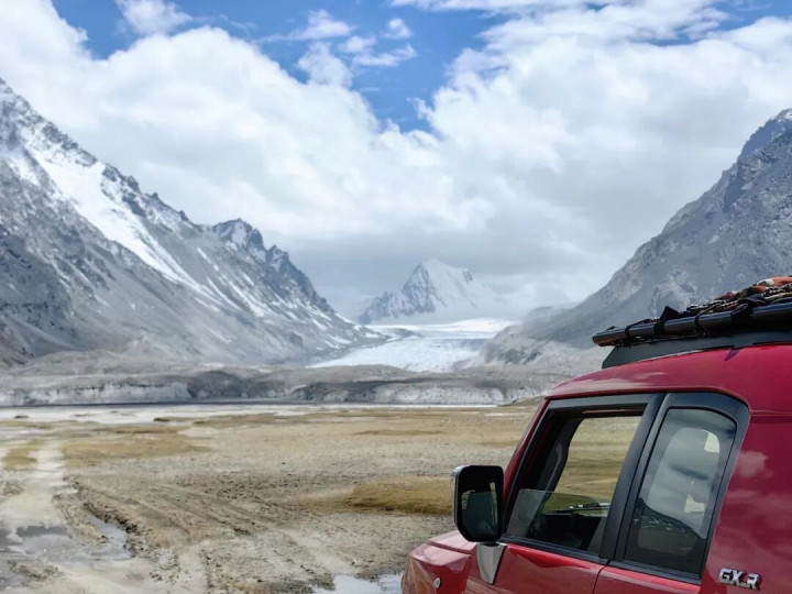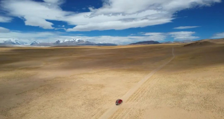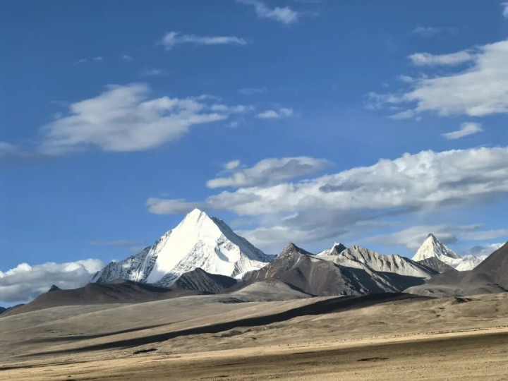 这一带路边出现了片片沙丘,蓝天、金沙、白云和大地上变幻的黑色云影,像大笔触高明度大色块涂抹的油画。可雪域高原哪来的沙漠?原来,是江源区特殊的水文和平坦而“中间宽广”的宽谷地形,以及干寒气候的共同作用形成了这些沙丘。G219仲巴段或远或近都有当却藏布(雅鲁藏布江)随行,它的源头,正是仲巴县境内喜马拉雅山脉北麓的杰玛央宗冰川。