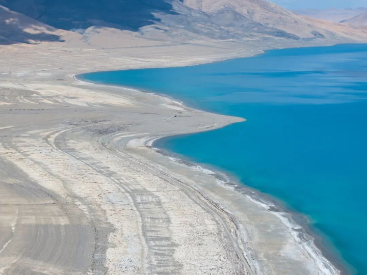 ▌杰玛央宗冰川脚下冰碛湖附近的滩涂,盐碱和沙化的痕迹。|©姚宇萱