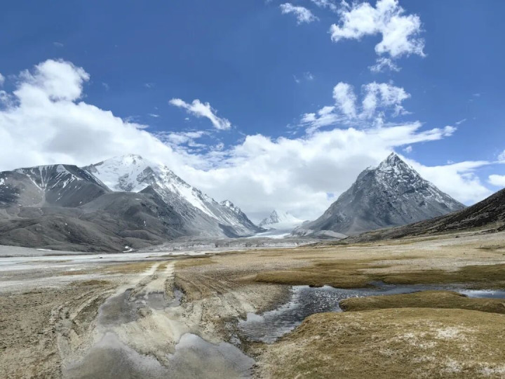 地上出现斑驳的盐碱了,冰川已越来越近。这一带海拔均在5000米以上,地形平坦开阔,沙地、浅滩、湿地交错,河床、河滩及山坡上,遍布着大大小小的石头。石头是冰川裹挟下来的,冰川融化退缩后,石头就留在了那里。每次见到这种场景,都感觉大洪水时代刚刚结束。