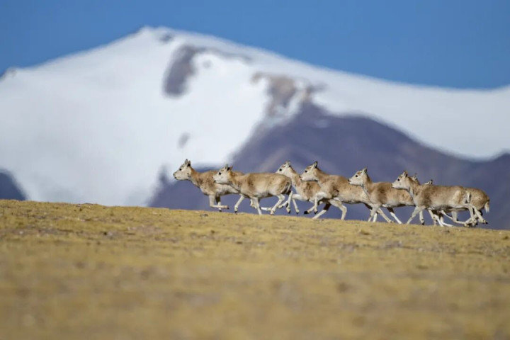 ▌羌塘国家级保护区,一群雌性藏羚羊在雪山前奔跑。©姜帆