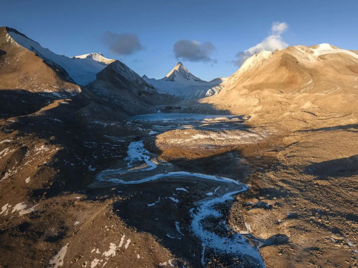最终,在离冰川还有一小段距离时我停下车,起飞无人机,用空中鸟瞰代替了与杰玛央宗的近距离亲近。不禁感慨,这是雅鲁藏布江正源啊,我无数次见过雅鲁藏布江的宽广和汹涌,不承想,这冰川融水聚成的清浅的、发辫一样交织缠绕的杰玛央宗,就是这条高原大江、中国最高长河最初的样子,她从这里出发,纳百川奔向海洋。