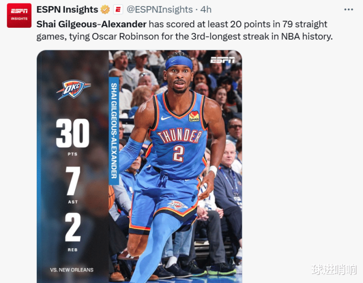 这是亚历山大本赛季第3次在第四节没有出战的情况下拿下30+得分表现,也是其生涯连续第79场拿下20+得分表现,成功追平大O并列历史第三,前二均由张伯伦占据(92场和126场)。