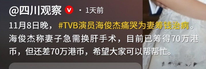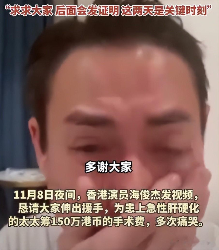 52岁的海俊杰对着镜头哭得像个孩子,眼睛肿得只剩一条缝,声音抖得不成样子:“我太太急性肝硬化,医生说48小时内凑不到150万港币做肝移植,人就没了!”