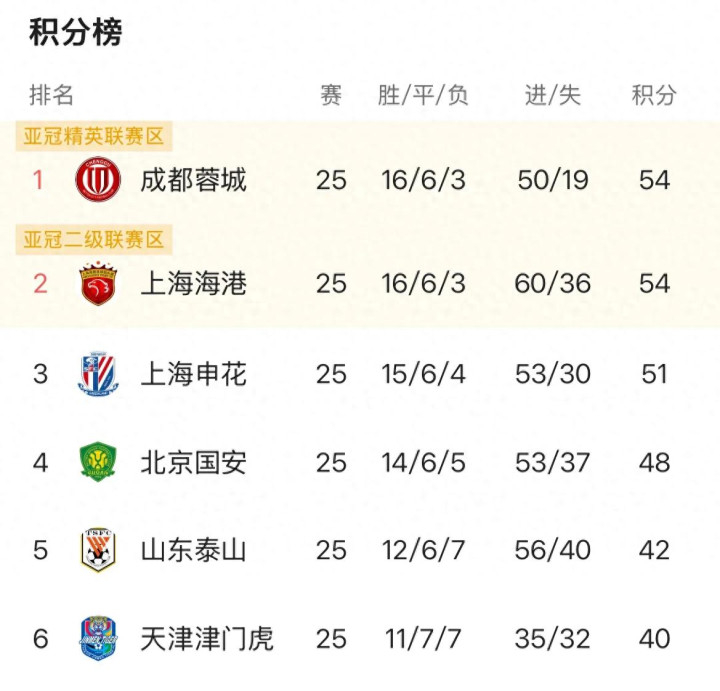 成都第一,海港第二,申花第三。