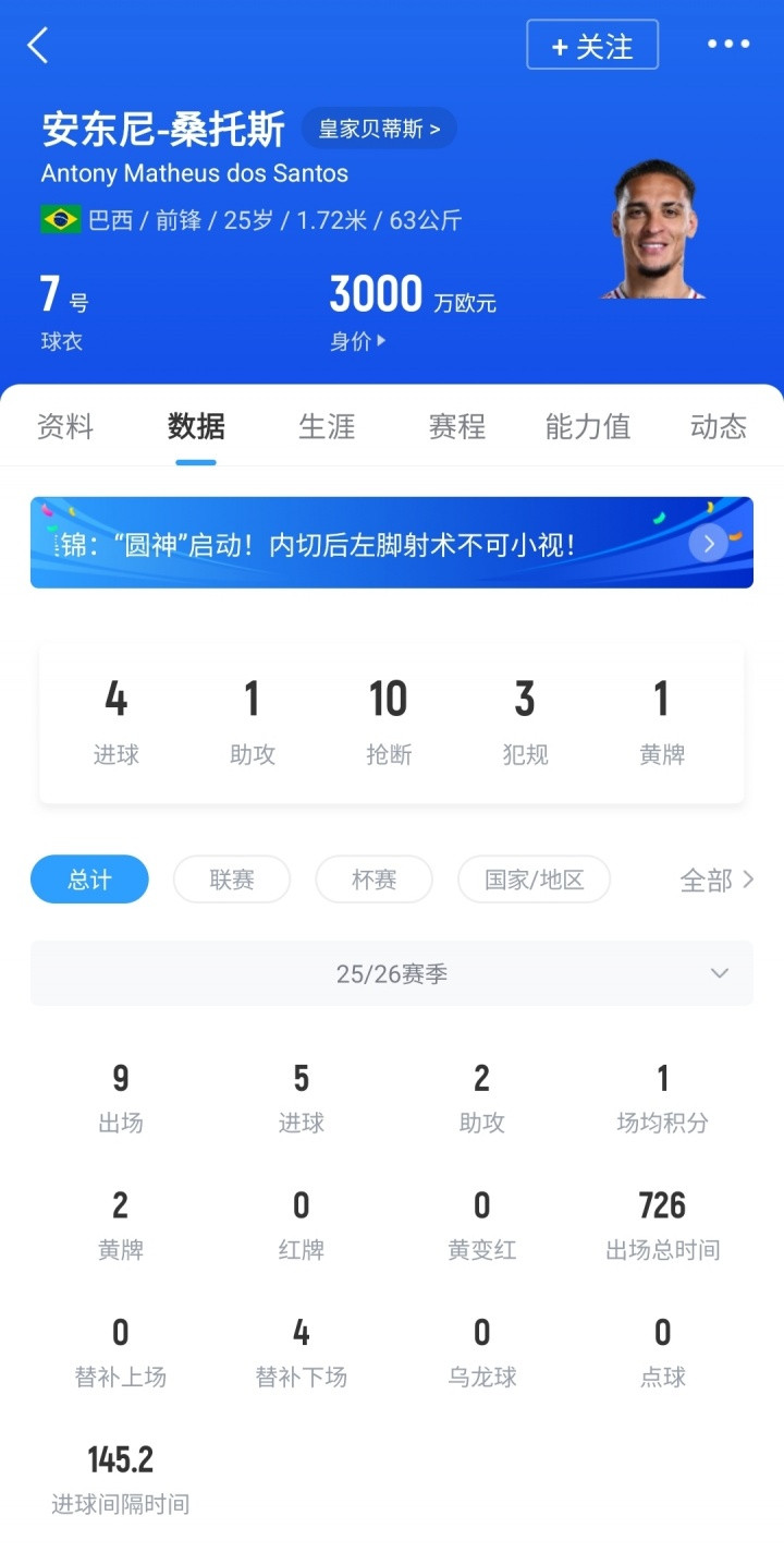 今夏以2200万欧永久转会贝蒂斯后,安东尼状态出色,各项赛事出战9场比赛,贡献5球2助,上一轮西甲安东尼2度轰出世界杯,并有1次助攻,包办3球帮助球队3-0击败马洛卡。